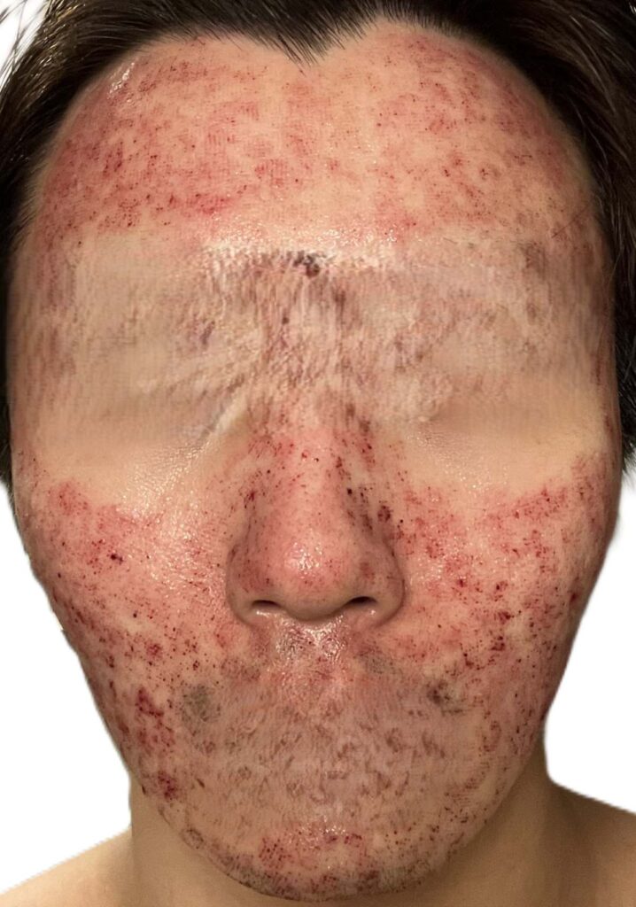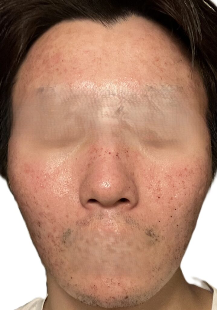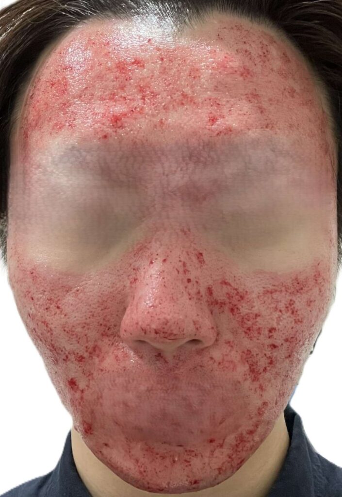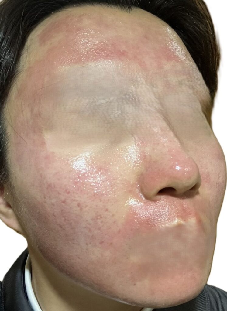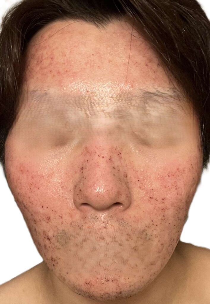 写真からわかる通り、顔全体が大けがした後のような赤みの状態になっております。またこの赤みは血によるもので、ティッシュなどで抑えると血がにじみ出てくる状態です。