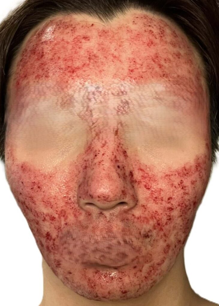 これは治療を受けた後、家に帰って取った写真ですが、至る所に赤みがありダウンタイムが長くなりそうなのがよくわかると思います。